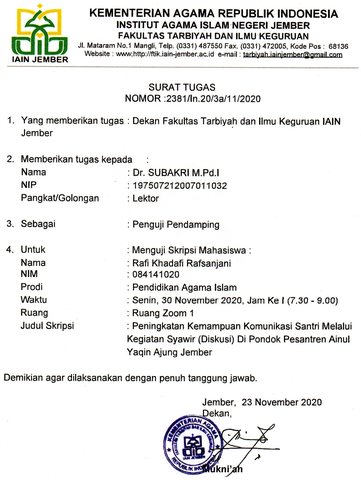 Subakri, Subakri (2020) Surat Tugas Pembimbing Skripsi atas nama Rafi Khadafi Rafsanjani. Perpustakaan IAIN Jember. (Unpublished)