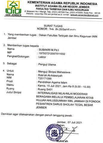 Subakri, Subakri (2021) Penguji Skripsi atas nama Robi'ah Al'Adawiyah prodi PAI. Perpustakaan IAIN Jember. (Unpublished)