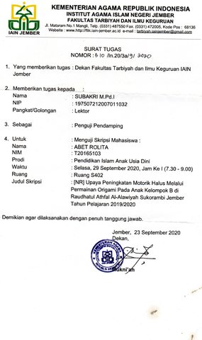 Subakri, Subakri (2020) Penguji Skripsi mahasiswa S1 atas nama Abet Rolita prodi PIAUD. Perpustakaan IAIN Jember. (Unpublished)
