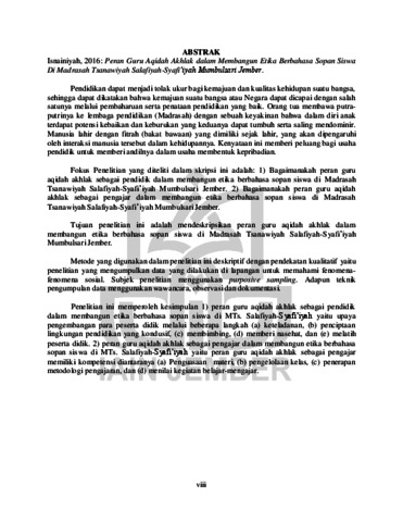 Tujuan penelitian ini adalah mendeskripsikan peran guru aqidah akhlak dalam membangun etika berbahasa sopan siswa di Madrasah Tsanawiyah Salafiyah-Syafi’ iyah Mumbulsari Jember.